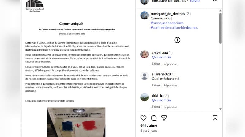 La mosquée de Décines-Charpieu dénonce "un acte lâche" et "islamophobe" après la découverte de tags sur une façade
